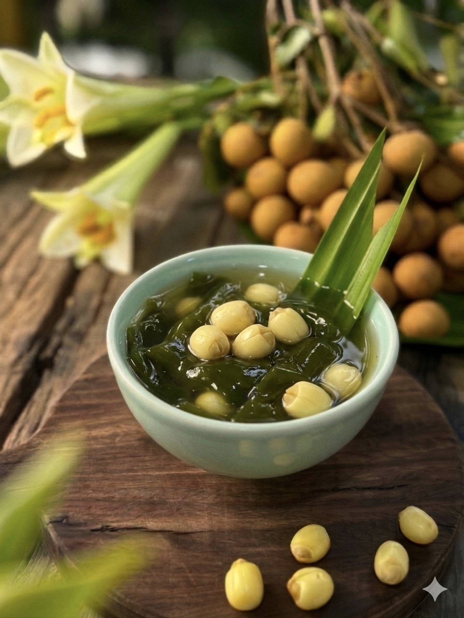 Lotus seed in sweet soup with herbal jelly.