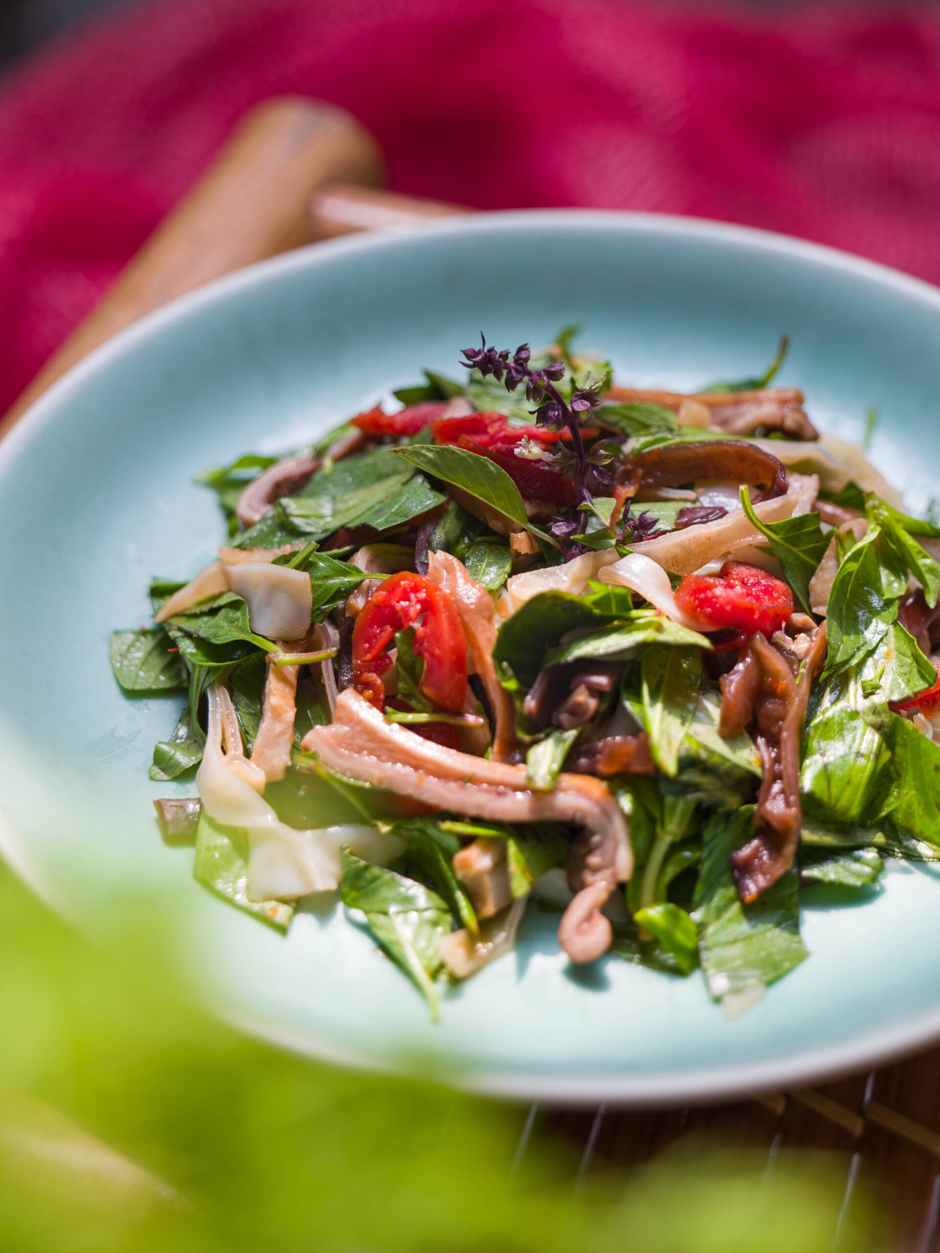 Fresh summer salad with marinated pork stomach and pink “chay” fruit from Quang Ngai, herbs, sweet and sour sauce.
